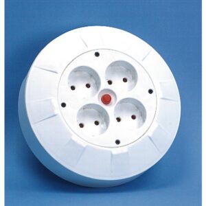 4-veis skjøtekontakt med selvstengende lokk og bryter. Kabel H07RN-F. Godkjent for utendørsbruk. IP44. Med opphengshull.