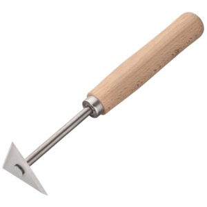 Skrape med triangulært / trekantet blad for fjerning av maling m.m. i vanskelige områder, f.eks. trapperekkverk. Leveres med et 60x60x60mm ferdigmontert blad i sterkt stål, som kan slipes (ikke utskiftbart). Kraftig og robust skrape, med langt trehåndtak for godt grep. Total lengde 25 cm.