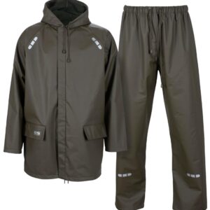 Regnsett bestående av jakke og bukse. Regnjakke: Sveisede sømmer. Glidelås og stormklaff med trykknapper i front. Luftehull skjult av klaff øverst på rygg. Børstet innside. Hette med strammesnor. Forlommer, begge med klaff. Trykknappregulering i ermeavslutning. Strammesnor i linning. Nakkehempe. Regnbukse: Sveisede sømmer. Strikk og strammesnor i linning. Trykknappregulering i ben. Hempe innvendig bak i linning.…